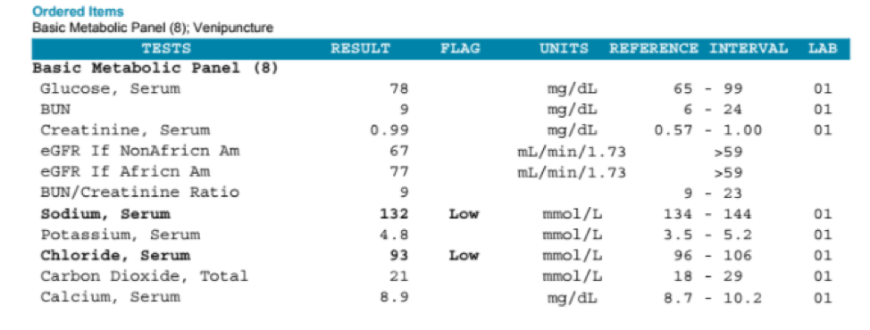 سدیم سرم (Na). این قسمت از آزمون مقدار سدیم موجود در خون را نشان می دهد. کلیه ها برای آزاد کردن سدیم بیش از حد در غذا و نوشیدنی ها کار می کنند. سطوح سدیم با کم شدن آب و یا هیدراتاسیون بیش از حد، مصرف مواد غذایی و نوشیدنی، اسهال، اختلالات غدد درون ریز، احتباس آب (علل مختلف)، تروما و خونریزی نوسان می کند.